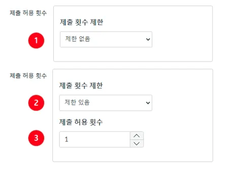학생들에게 제출 허용 횟수를 제한하려면 제한 있음[2]을 선택합니다. 그런 다음 제출 허용 횟수[3]에서 제출을 허용할 시도 횟수를 지정합니다. 한번 제출하면 더 이상 제출할 수 없도록 하기 위해서는 재시도 횟수에 '1'을 입력하여 설정할 수 있습니다.