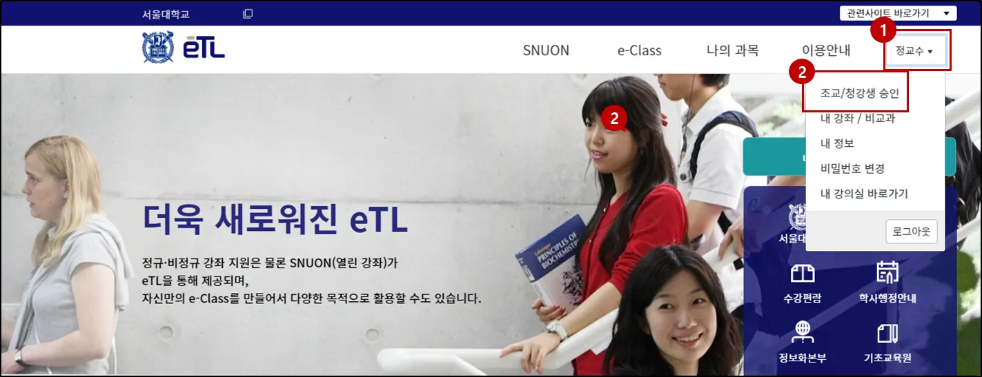 1-2. [조교/청강생 승인] 메뉴를 클릭하여 승인 및 관리할 수 있는 메뉴로 접속합니다.