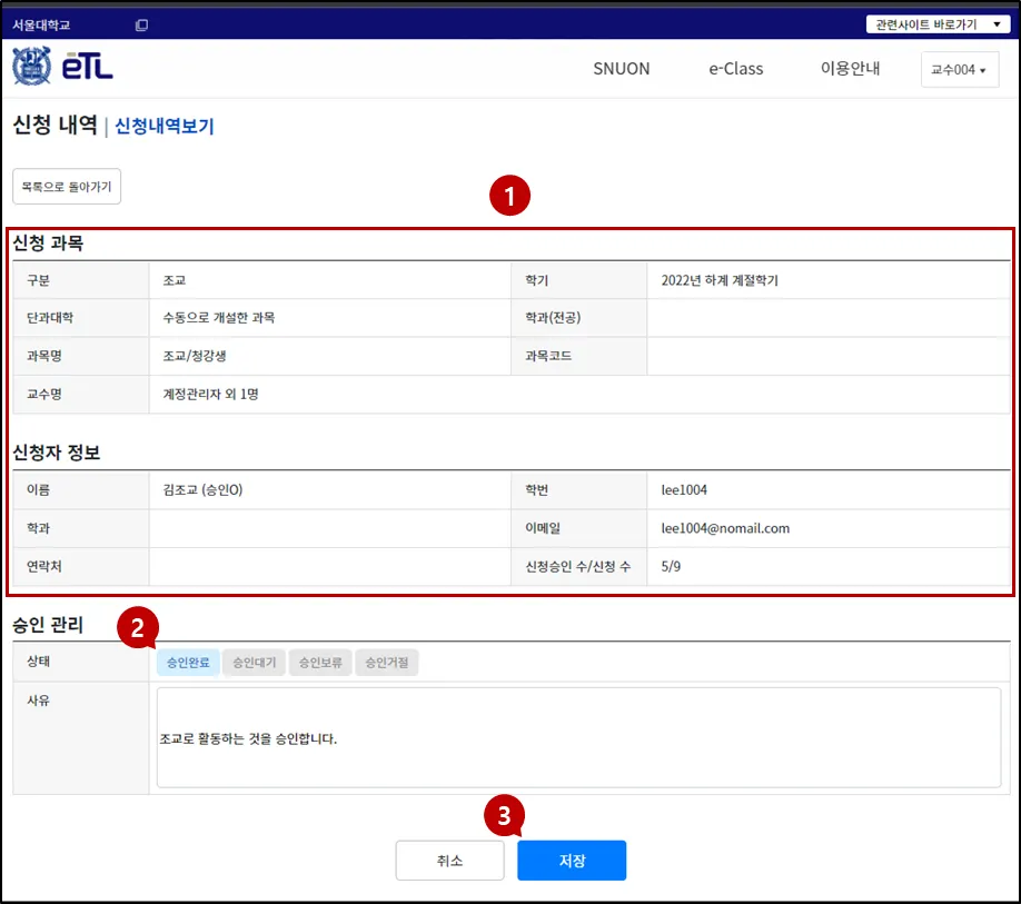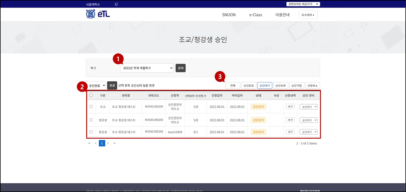 조교/청강생 승인 기능을 통해 과목에 조교/청강생으로 신청한 이용자의 승인 현황을 확인하고 승인 상태를 변경할 수 있습니다.