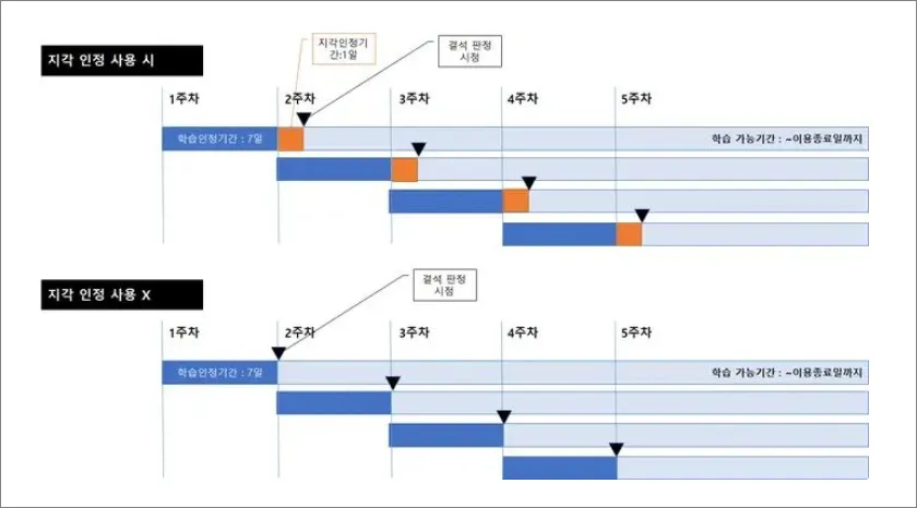 학습 인정 기간 및 지각 인정 기간이 지나도 학습은 가능하지만 학습 기록은 출결에 반영되지 않습니다.