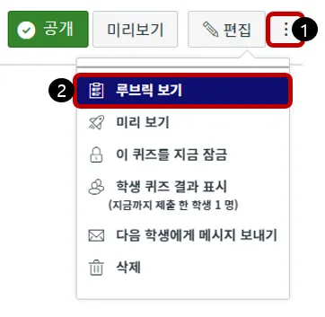 우측 상단의 [더 보기]버튼(점 3개)[1]을 눌러, ‘루브릭 보기’[2]를 선택합니다 .