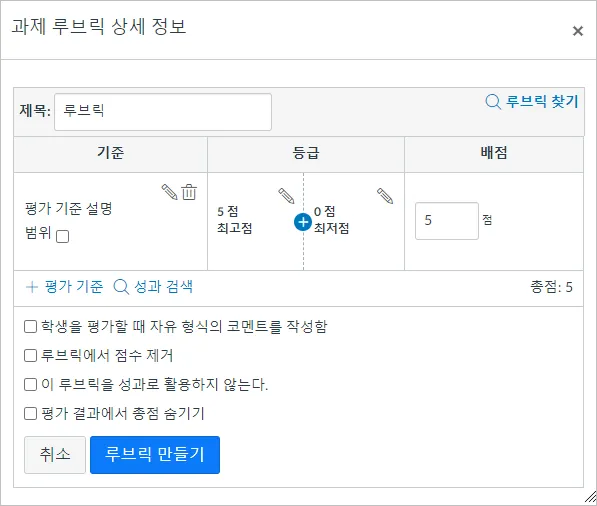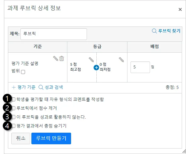 루브릭을 추가한 후에는 루브릭에 대한 여러 옵션을 선택할 수 있습니다.