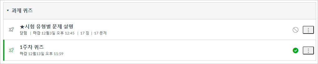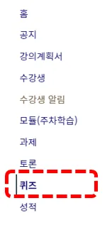 과목 메뉴에서 ‘시험 및 설문’을 눌러 이동합니다. 열람하고자 하는 과제의 이름을 선택합니다.