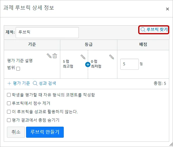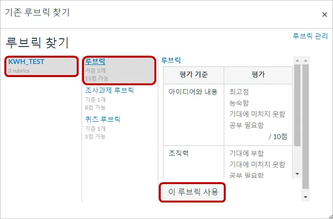 기존 루브릭을 찾으려면 상단 우측의 [루브릭 찾기]를 누르십시오.