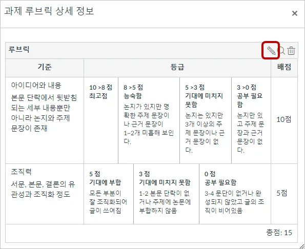 루브릭을 편집하려면 편집 아이콘[1]을 선택합니다. 루브릭을 기존에 생성해둔 루브릭으로 바꾸려면 검색 아이콘[2]을 누르십시오.