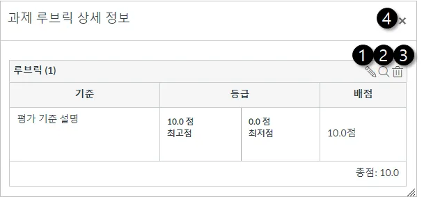 과제에서 루브릭을 삭제하려면 삭제 아이콘[3]을 선택합니다 . 루브릭이 ‘과제’ 항목에서 생성되었고 다른 코스 콘텐츠에 연결되어 있지 않은 경우, 삭제 시 해당 루브릭은 코스에서 제거됩니다.