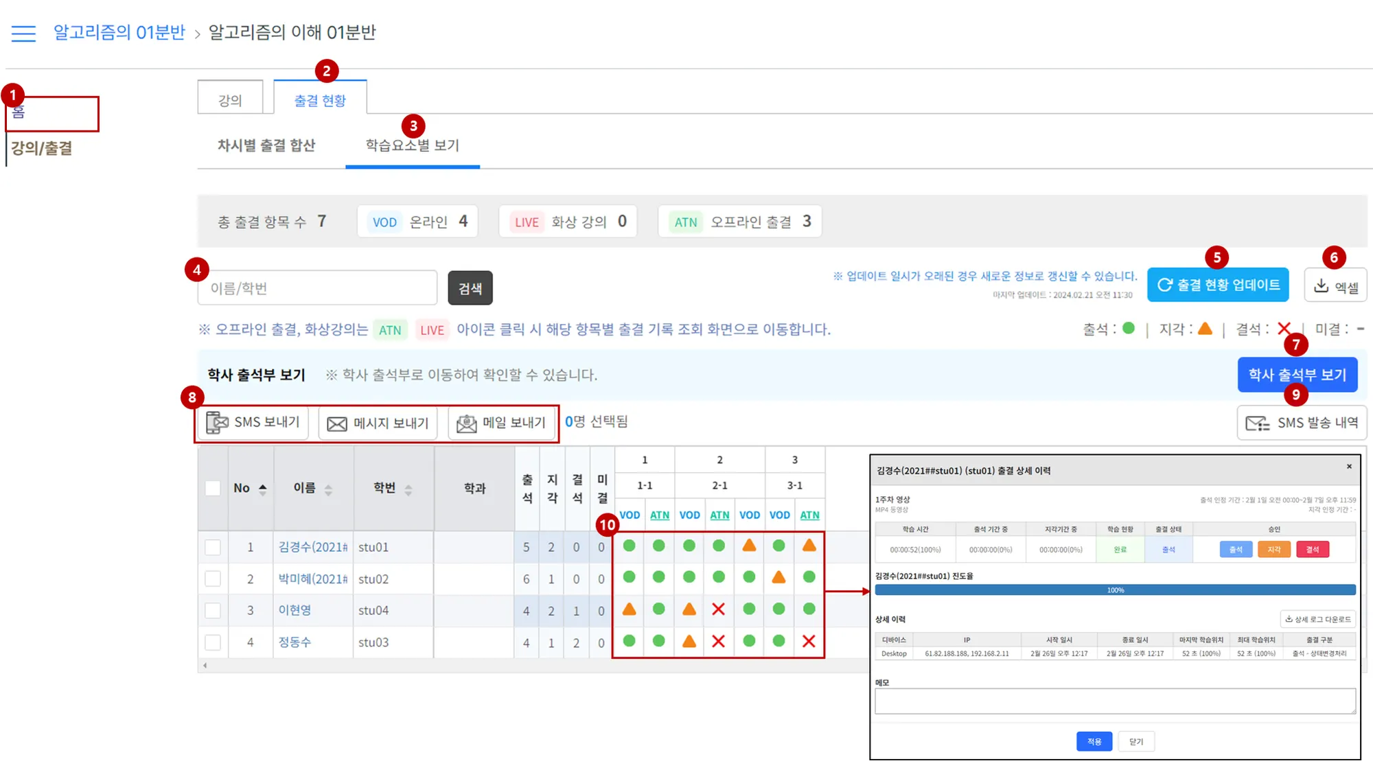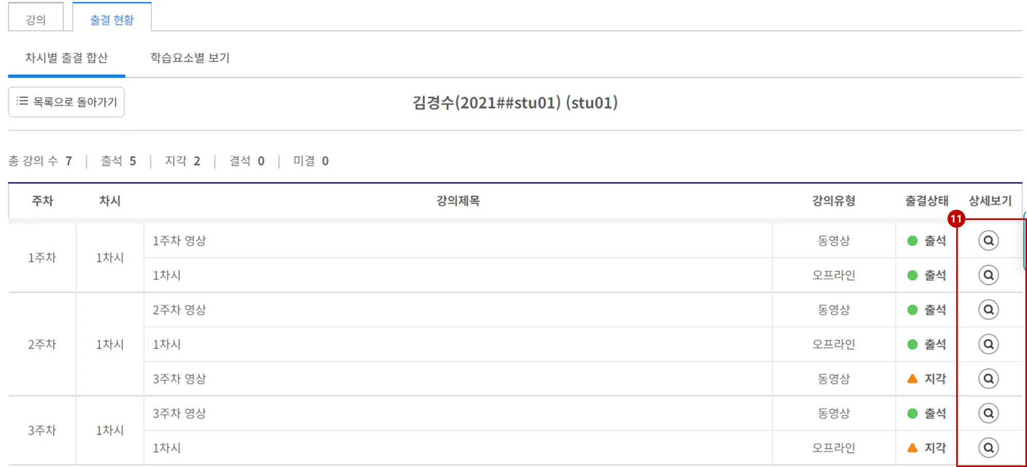 학습자의 주차/차시별 출결 상세 이력을 확인합니다.