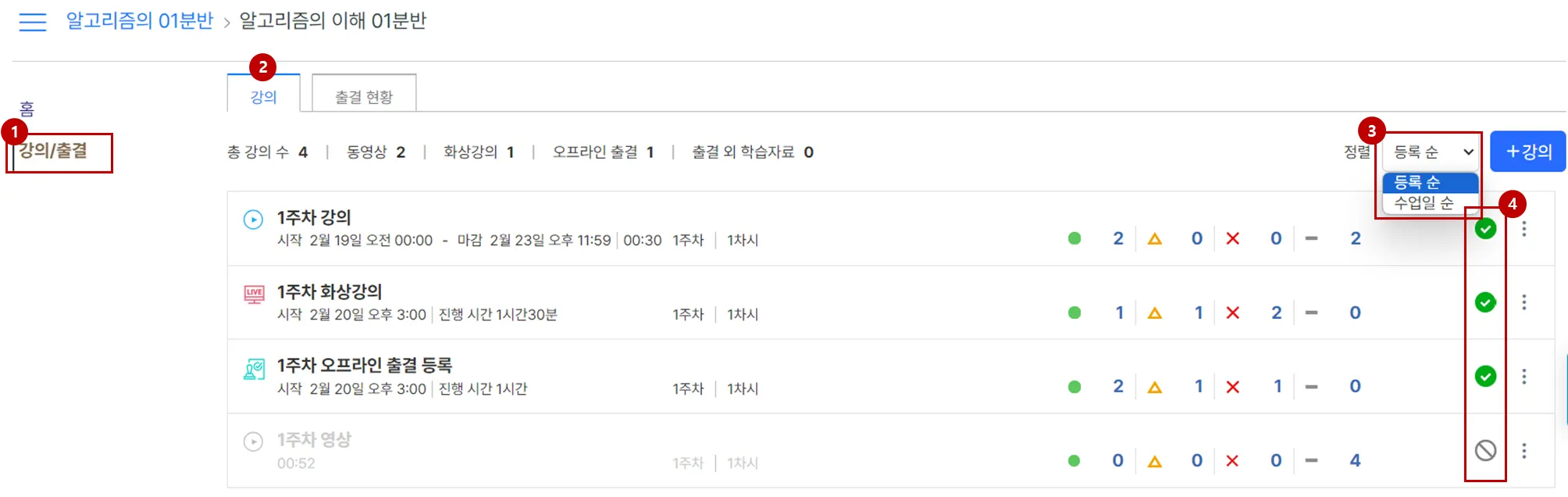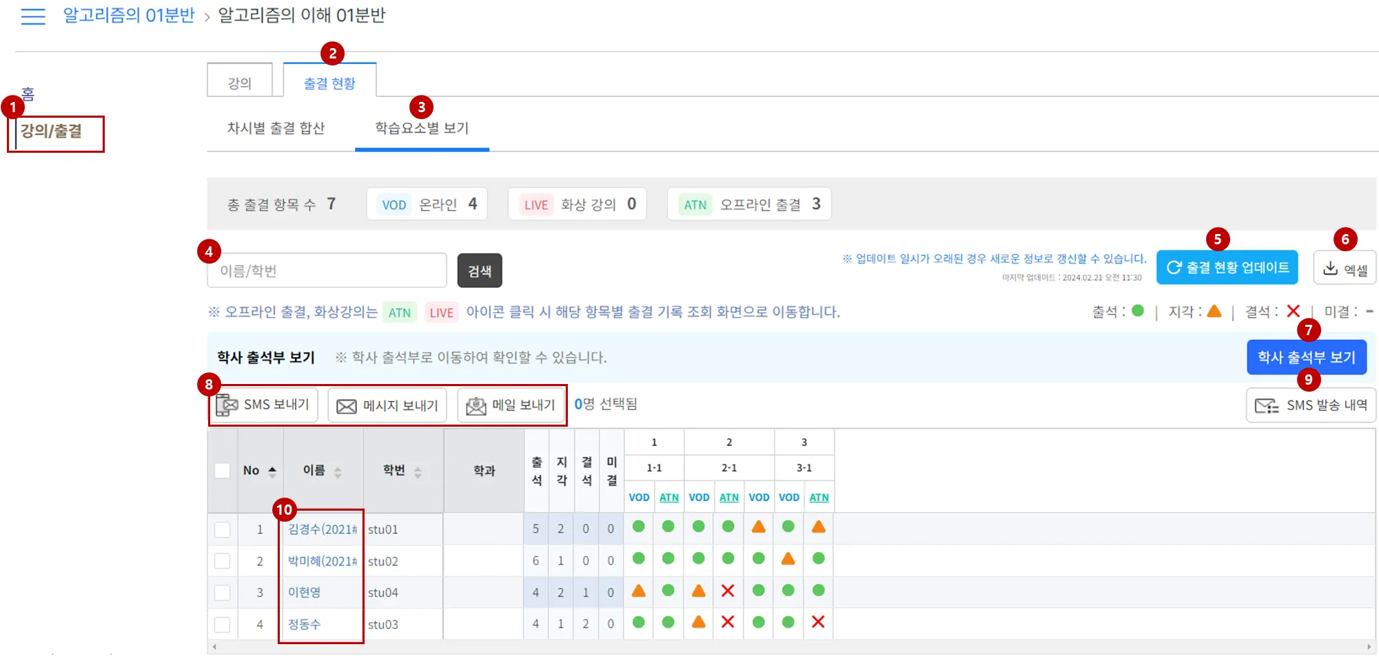 학습자의 동영상 강의에 대한 출결 현황을 관리합니다.