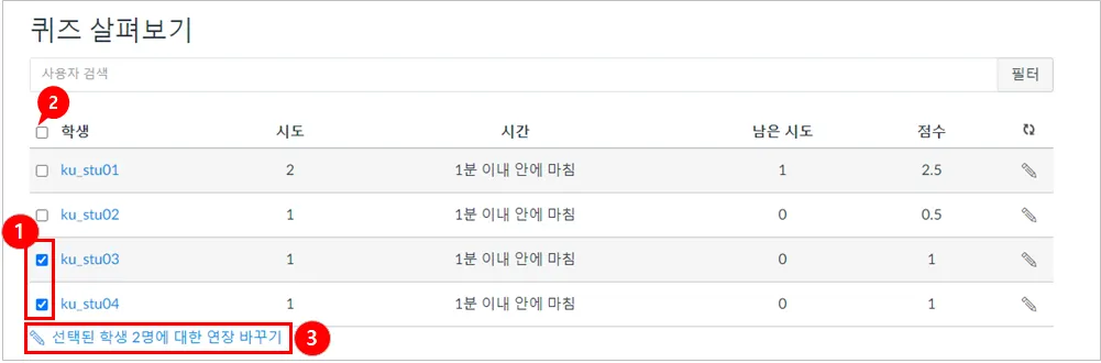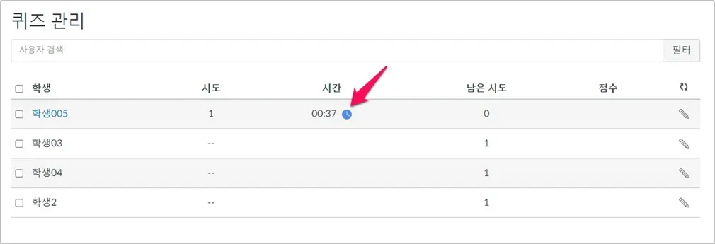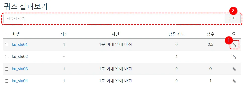 '퀴즈 관리'에서는 각 학생들이 풀이를 시도한 횟수와 풀이 시간, 남은 시도 여부와 점수가 표시됩니다. 특정 학생의 퀴즈 시도 횟수를 조정하려면 학생 항목 우측의 ①편집 아이콘을 눌러 조정합니다. ②사용자 검색 을 통해 특정 학생을 검색할 수 있습니다.