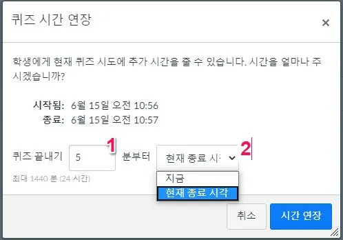 퀴즈의 현재 설정된 퀴즈 종료시간으로부터 특정 시간(분)만큼 연장하려면 드롭 다운 메뉴에서 ‘현재 종료 시간’ 옵션을 선택하십시오 .