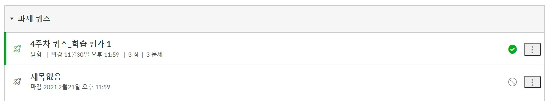 참고 : 퀴즈의 마감/열람종료일이 설정되어 있는데, 응시 중 연장해 준 시간이 이보다 이후 시간일 경우, 학생은 연장된 시간만큼 풀이하고 제출할 수 있습니다. 다만 이 제출은 마감/열람종료일 이후 제출된 것이므로 ‘지각’ 제출로 표기됩니다.