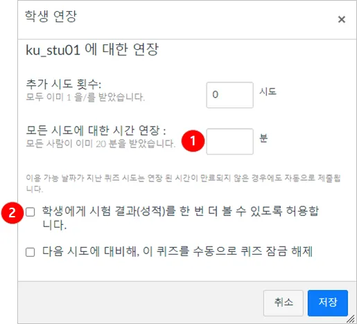 퀴즈에 시간 제한이 있으나 더 많은 시간을 주고 싶다면 '모든 시도에 대한 시간 연장'[1] 입력란에 추가해 줄 시간을 분 단위로 입력합니다.