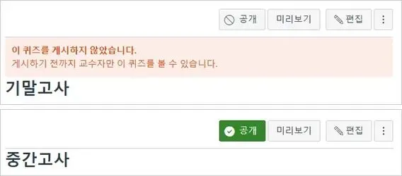 개별 퀴즈 페이지 내에서 공개 상태 보기와 설정