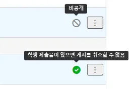 만약, 이미 공개되어 해당 퀴즈에 대해 답변을 제출한 학생이 있을 경우, 마우스를 아이콘 위에 올려보면 '제출물이 있는 퀴즈일 경우 공개를 취소 할 수 없다'는 메시지가 표시되고 이 경우 해당 퀴즈를 비공개 상태로 변경할 수 없습니다.