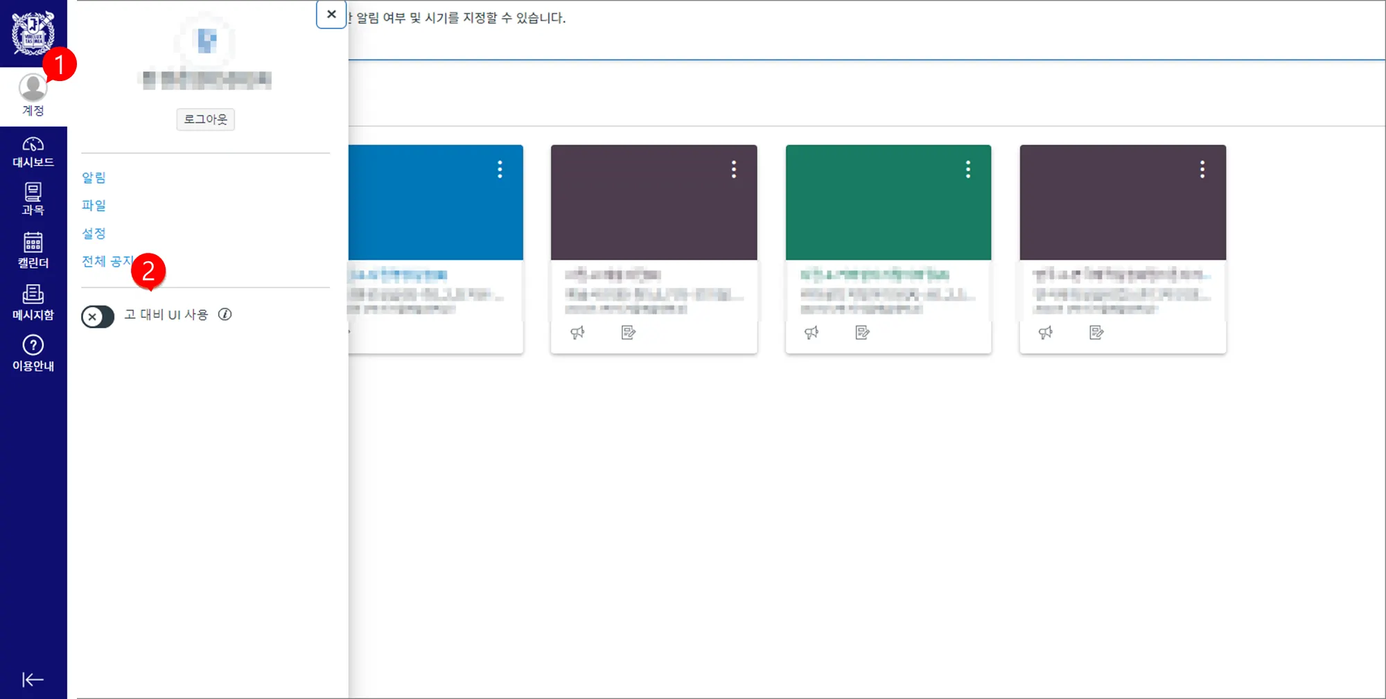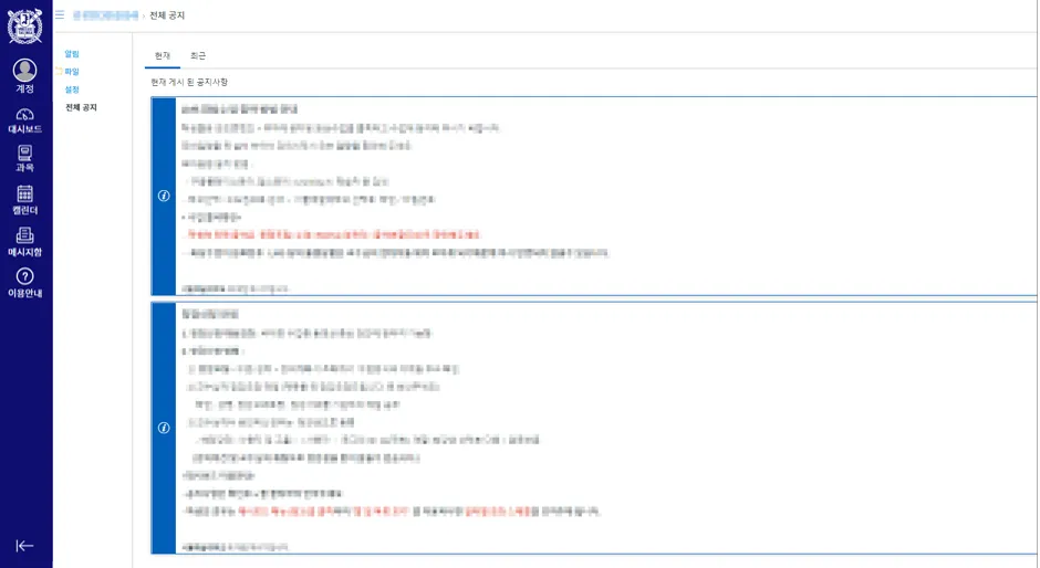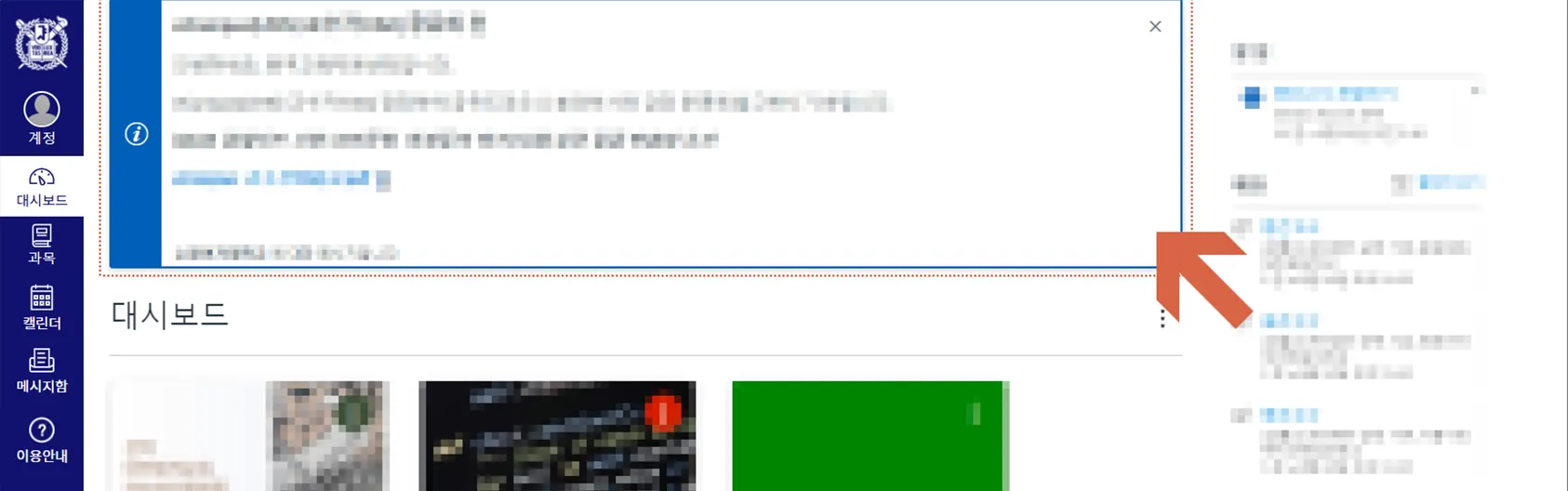 대시보드 공지사항은 학내 구성원에게 뚜렷하게 노출할 수 있도록 대시보드 상단에 배치됩니다. 이에 따라 사용자 본인이 소속된 과목 카드는 아래로 이동하여 배치됩니다. 필요에 따라 사용자는 확인한 공지사항의 X를 눌러 대시보드에서 제거할 수 있습니다. 이때 제거한 공지사항을 다시 열람하고자 할 경우 아래 방법을 참고해주세요.