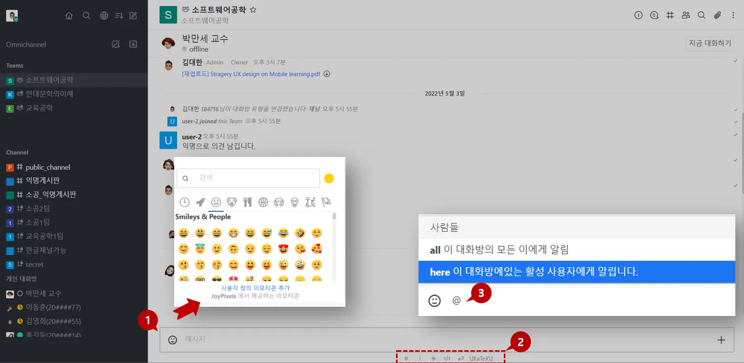 ③ 구성원 언급하기 : 멘션기능 @을 사용하여 [모두, 현재 접속한, 특정 구겅원]을 언급하여 메시지를 입력할 수 있습니다.