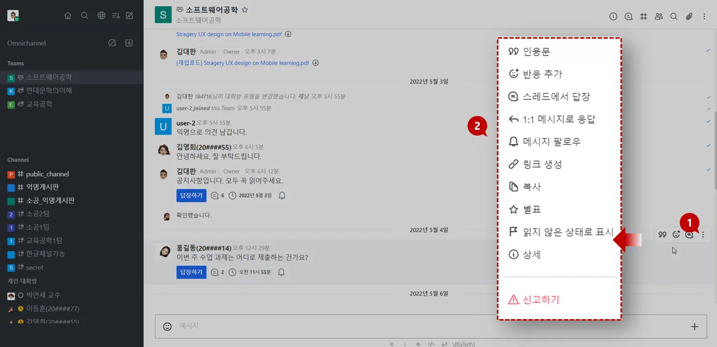 [참고] 내가 쓴 메시지인 경우 ‘읽지 않은 상태로 표시’ 대신 ‘수정’, ‘삭제’ 버튼이 추가로 표시됩니다.