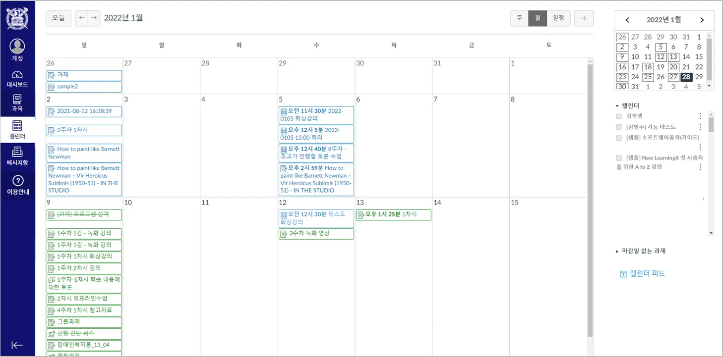 캘린더를 보려면 ‘캘린더’를 눌러 이동합니다. 캘린더를 통해 계정 내 모든 과목의 일정을 주/월 간 단위로 확인할 수 있으며 강의 일정, 교수 상담 시간 등을 등록하고 학습자에게 공유할 수 있습니다.