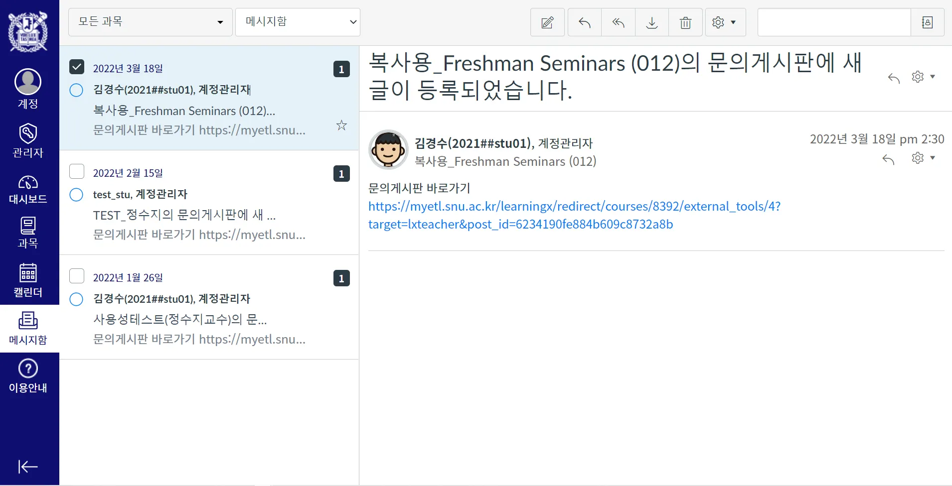 메시지 함을 보려면 ‘메시지 함’을 눌러 이동합니다. 메시지는 과목의 다른 사용자와 통신 할 수 있는 LearningX 메세지 시스템입니다. 메시지 함을 누르면 페이지 우측에 메시지 리스트가 생성됩니다. 메시지 리스트 상단의 드롭 다운 메뉴로 확인하고자 하는 과목을 필터링 할 수 있습니다. 메시지 리스트 내 우측에 표기되는 숫자 박스는 상대방과 주고 받은 총 메시지의 개수를 의미합니다.