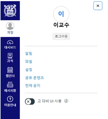 사용자 정보를 보려면 계정을 누르십시오. 계정 관리자는 우측에 나타나는 '사용자 설정’, ‘알림 기본 설정’, ‘개인 파일’ 을 이용할 수 있는 권한이 있으며 계정 설정을 지정/변경할 수 있습니다. 학교 기관에서 프로필을 활성화 한 경우 계정 관리자 프로필에 접근 할 수 있습니다.