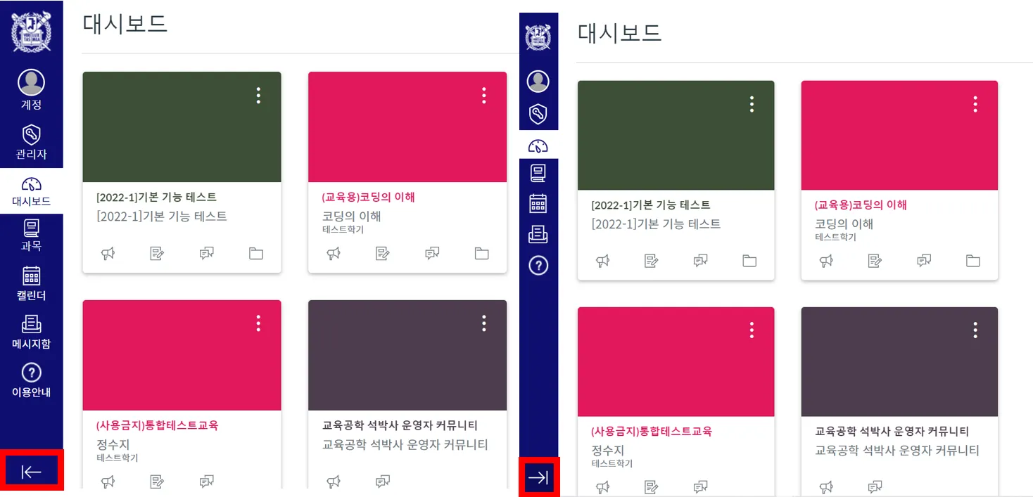 글로벌 탐색 메뉴는 eTL 모든 페이지의 좌측에 있습니다. 이 메뉴는 계정 내 모든 과목에 대한 접근을 통합적으로 제공하며, 이를 통해 자주 사용하는 eTL기능에 빠르게 접근 할 수 있습니다. 글로벌 탐색 메뉴의 기본 옵션은 ‘대시보드’, ‘과목’, ‘캘린더’, ‘메시지 함’, ‘사용자 계정' 및 '이용 안내’ 입니다.