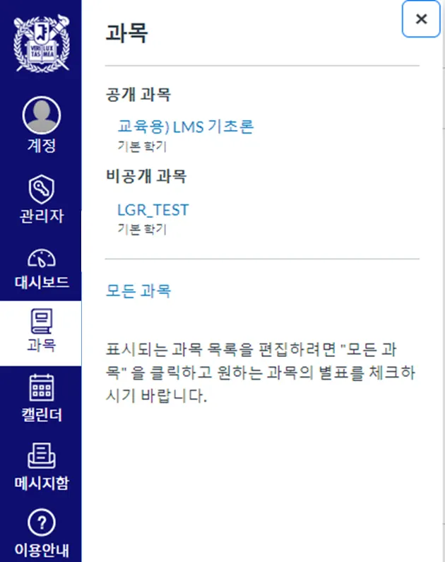과목을 누르면 우측 화면에 사용자가 즐겨 찾기 한 과목이 표시됩니다. 즐겨 찾기로 선택한 과목이 없으면 현재 수강 중인 모든 과목이 과목 목록에 표시됩니다. 과목 목록에는 학기 이름이 일부 표기됩니다.