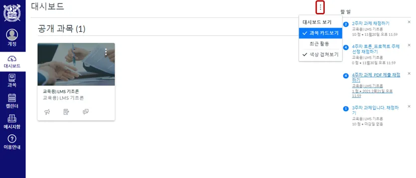 대시보드는 eTL에 사용자가 로그인 한 후 처음 방문하는 페이지입니다. 우측 상단의 [더 보기] 버튼(점 3개)을 눌러 ‘과목 보기’ 또는 ‘최근 활동 보기’ 로 페이지를 전환할 수 있으며 ‘할 일/예정 목록’을 통해 모든 과목에 대한 알림을 확인할 수 있습니다.