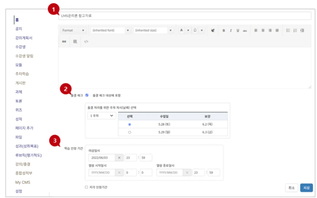 예시: 만일 열람 시작일시를 8/10로, 마감일시를 8/17로, 지각일시를 8/18로 지정하였을 경우, 학습자는 해당 주차를 8/10부터 학습할 수 있으며 8/10~17 사이에 학습해야 출석한 것으로 인정됩니다. 8/17 ~ 18에 학습할 경우 지각으로 인정됩니다.