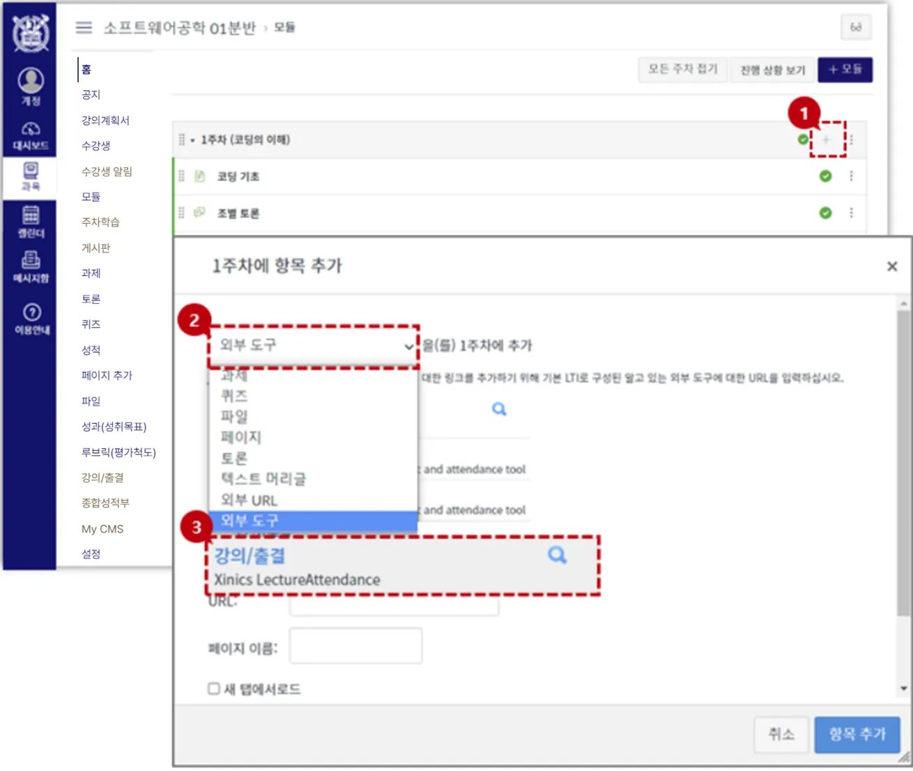 출결 대상 학습 요소를 업로드하시는 경우, 출결 체크를 위한 주차 및 수업일, 보강일을 설정하는 항목이 표시됩니다. 주차를 선택하시면 해당 주차에 상응하는 수업일과 보강일이 학사 일정을 기준으로 표시되며 필요에 따라 학습 인정 기간을 변경할 수 있습니다.