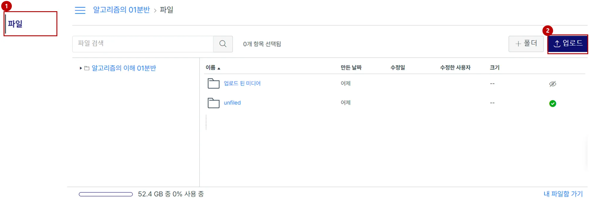 보통은 파일 메뉴에서 직접 등록하는 것보다 공지, 과제 등을 등록할 때 첨부파일이 등록되는 경우가 대부분입니다.