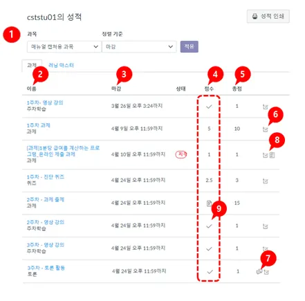 과제 항목의 이름[2], 마감일[3], 획득한 점수[4], 과제의 총 점수 값[5]을 볼 수 있습니다.