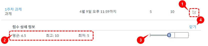 [2] 점수 세부 정보를 통해 과제의 점수 분포를 보고 평균 점수와 최고, 최저 점수를 볼 수 있습니다.