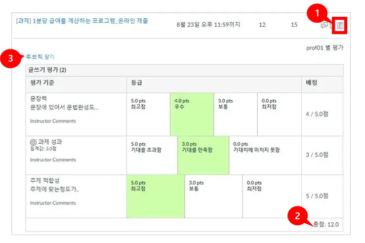 [1] 루브릭 아이콘이 포함된 과제는 과제 평가 시 루브릭을 이용하도록 설정된 경우입니다.
