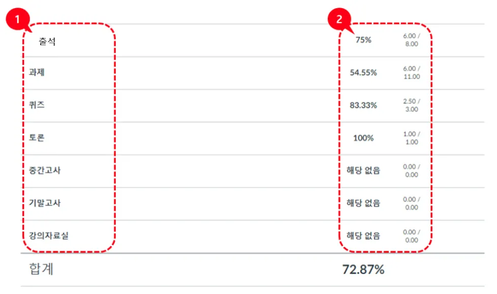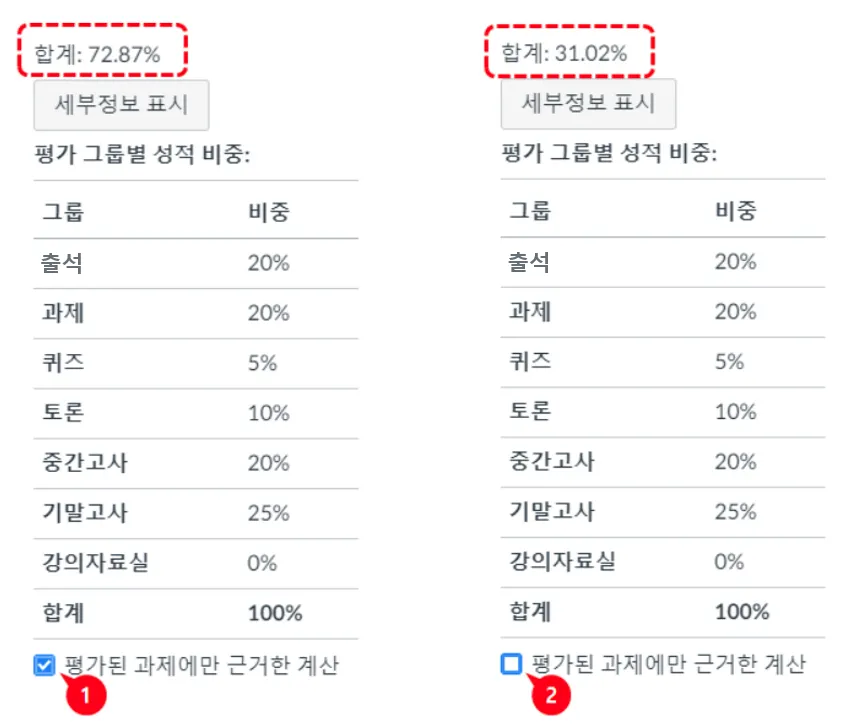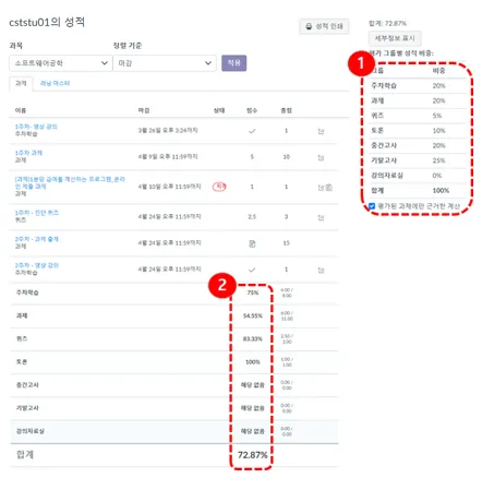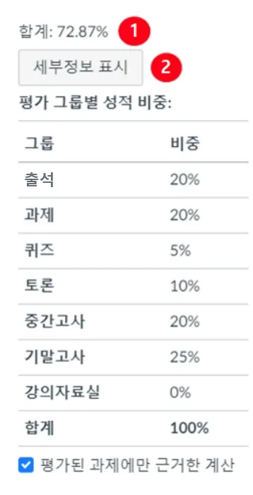 [참고 사항] : 교수자는 과제 그룹 비율에서 학생이 성적 합계를 볼 수 없도록 제한 할 수 있습니다.