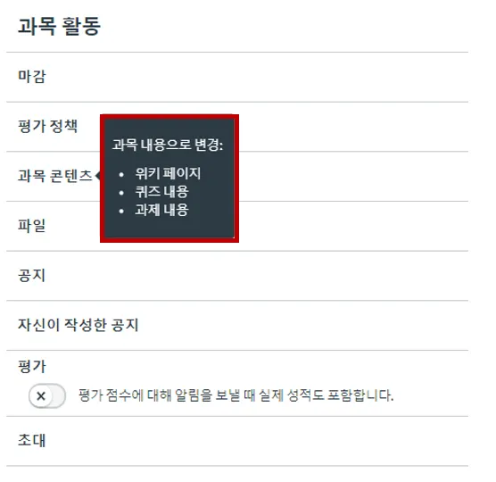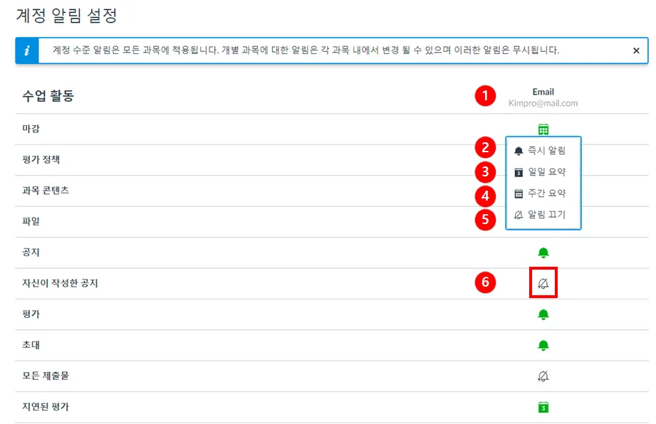 - 과목에서 알림 기본 설정이 변경되면 과목 알림 기본 설정이 계정 설정에 설정된 기본 설정보다 우선합니다. 이 경우, 과목 내에서 해당 알림 유형을 계속 관리해야 합니다.