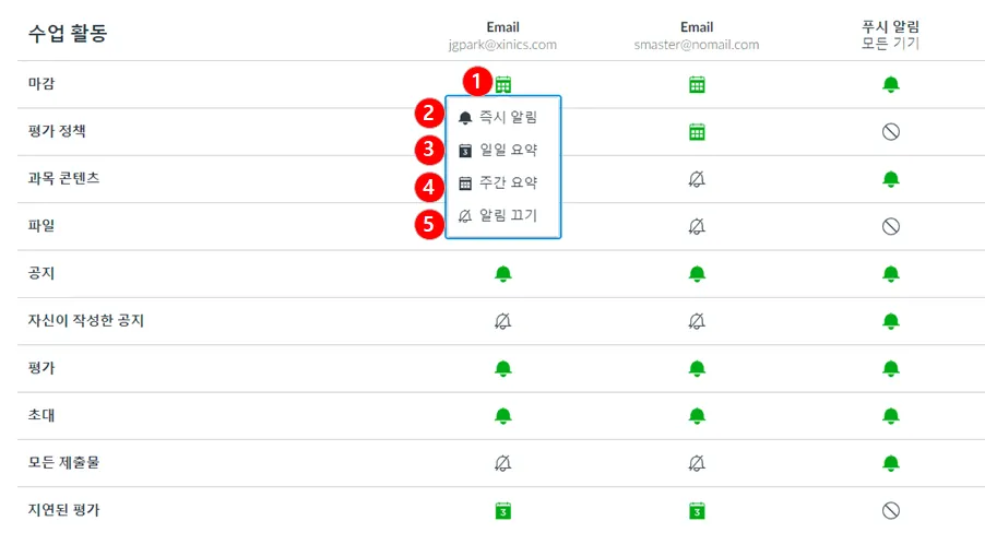 특정 과목 기능에 대한 알림을 관리하려면 알림 방법에 대한 연락 방법 아이콘[1]을 선택하십시오. 과목에 대한 알림 수신 빈도를 선택할 수 있습니다. 옵션에는 즉시 알림[2], 일일 요약[3], 주간 요약[4] 또는 알림 끄기[5]가 있습니다.