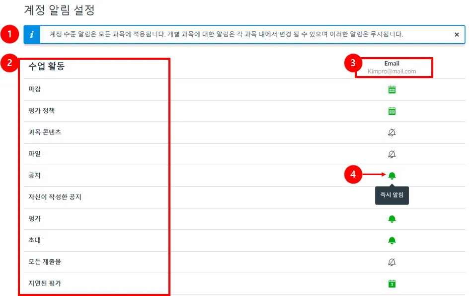 계정 수준 알림 유형을 나타내는 수업 활동(과목 활동)[2] 및 나열된 연락 방법[3]을 봅니다.