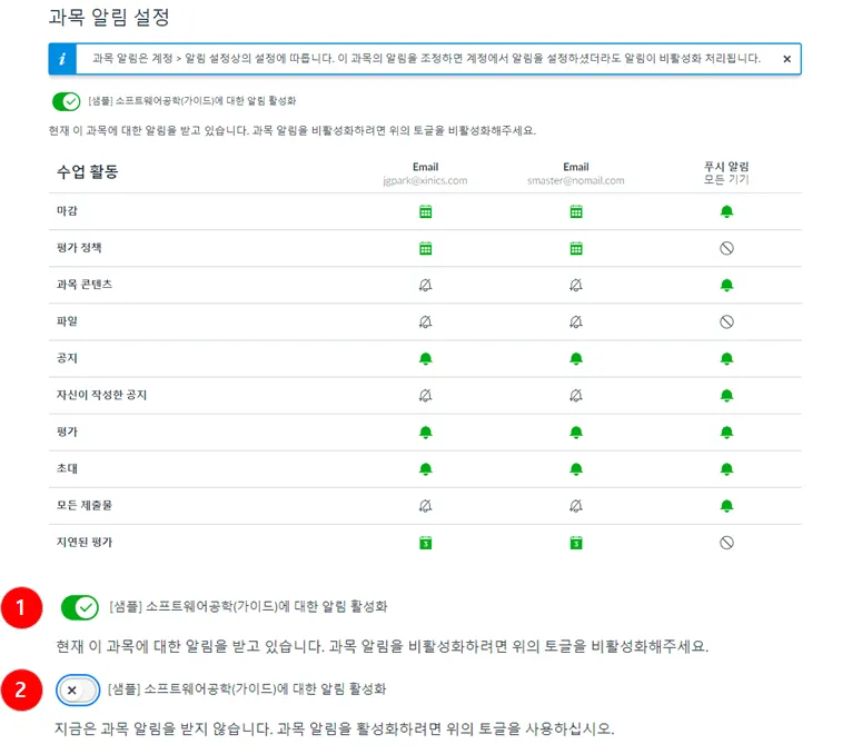 과목 알림 설정을 관리하려면 알림 활성화 토글을 선택하여 알림을 활성화 합니다. 과목에 대한 알림이 활성화되면 토글에 체크 표시 아이콘[1]이 표시됩니다. 과목에 대한 알림이 비활성화 되면 토글에 X 아이콘 [2]이 표시됩니다.