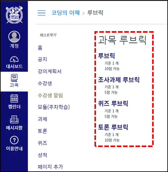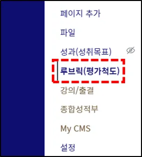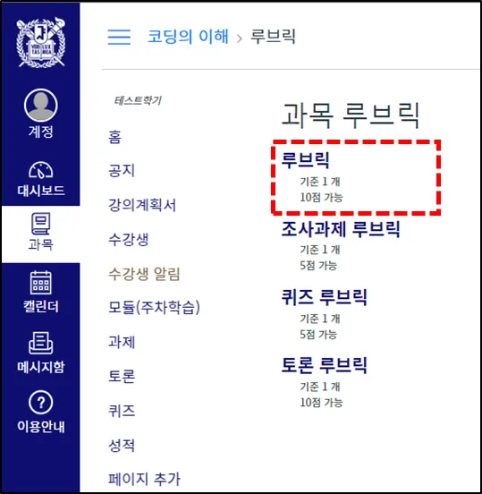 과목 메뉴의 루브릭을 눌러 이동합니다.