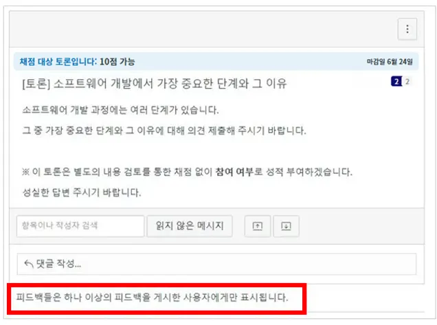 채점 대상 토론 관련 정보[1] : ‘채점 대상 토론입니다’ 라는 문구와 배점, 마감일 등 추가 정보가 표시됩니다.