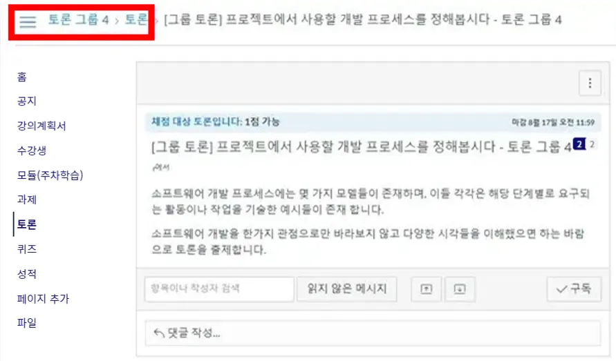 과목 메뉴에서 ‘토론’을 눌러 이동합니다.