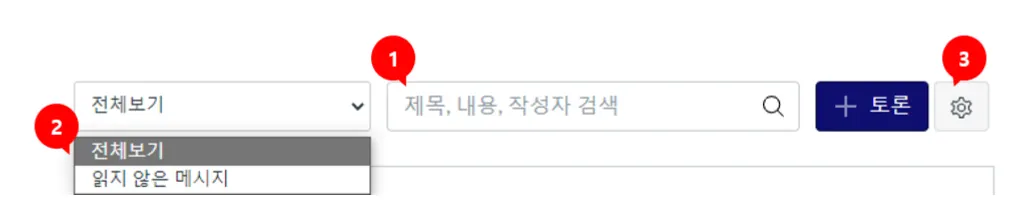 검색 란[1]에 토론 제목, 사용자 이름 또는 키워드를 입력하여 토론을 검색할 수 있습니다.
