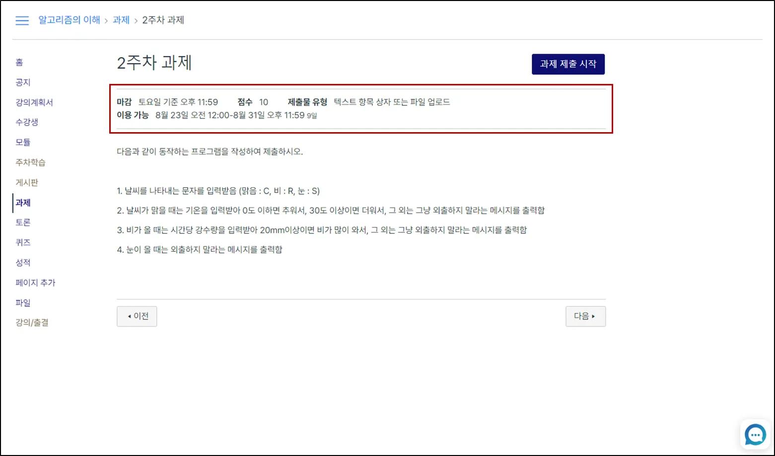 과제를 제출하려면 상단의 과제 제출 시작 버튼을 클릭하십시오.