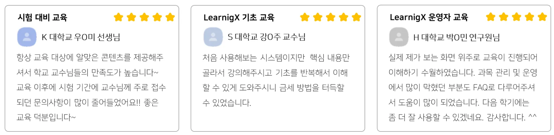 학교 운영자 선생님 및 교수님들도 모두 만족하실 수 있는 양질의 교육 콘텐츠를 제공해드리며, 실제 강의를 수강하신 분들은 다음과 같이 긍정적인 후기를 남겨주셨습니다.