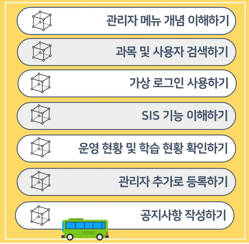 LMS 사전 경험이 전혀 없는 입문자나 다양한 기능 활용으로 온라인 강의 운영에 박차를 가하고 싶은 사용자를 대상으로 합니다. 막힘이 없는 온라인 강의 운영을 위해 단기간에 집중 성장할 수 있는 커리큘럼이 준비되어있습니다!