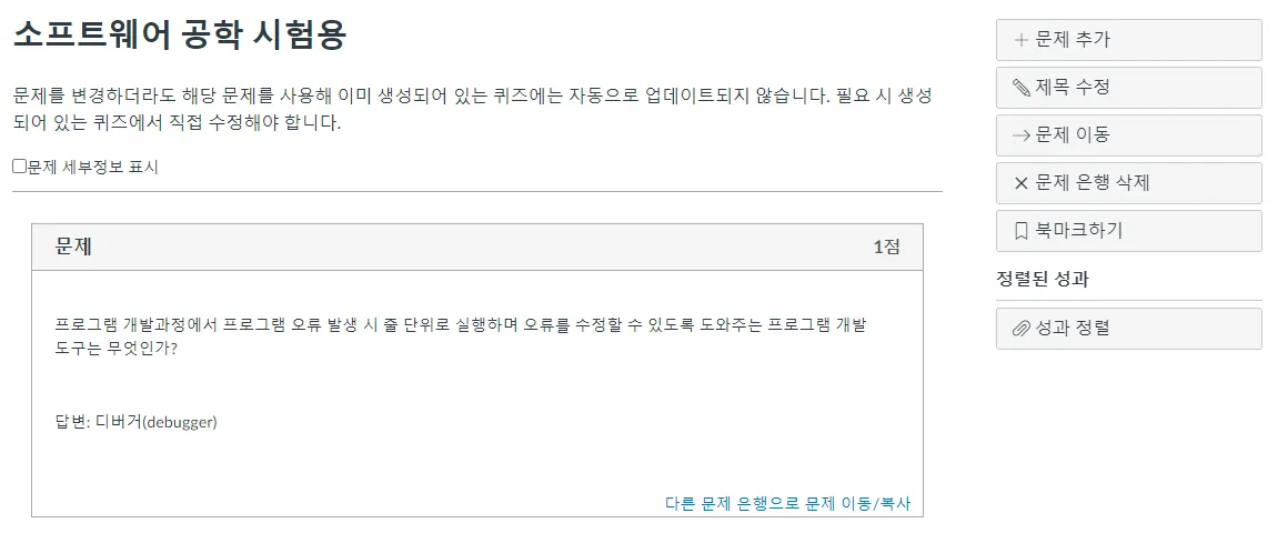 문제 은행의 각 문제들을 상세하기 확인하기 위해서는 '문제 세부정보 표시' 란을 체크합니다.