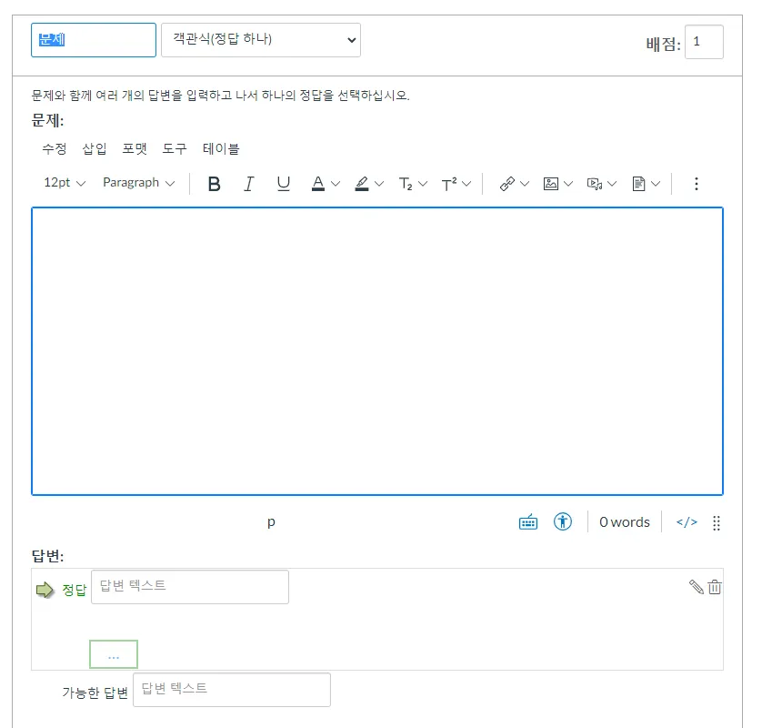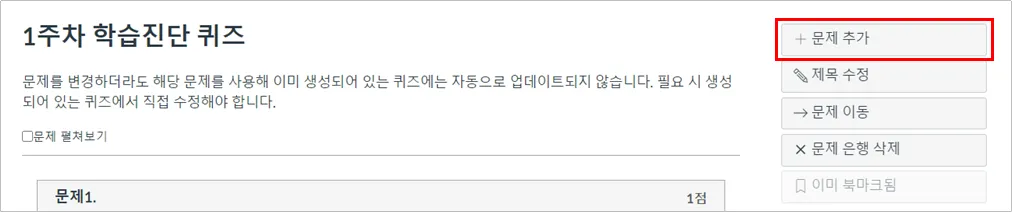 이렇게 문제 은행에 퀴즈를 생성해 놓으면 여러 다른 시험/퀴즈를 만들 때 문제 은행에서 바로 가져다 손쉽게 구성할 수 있습니다.