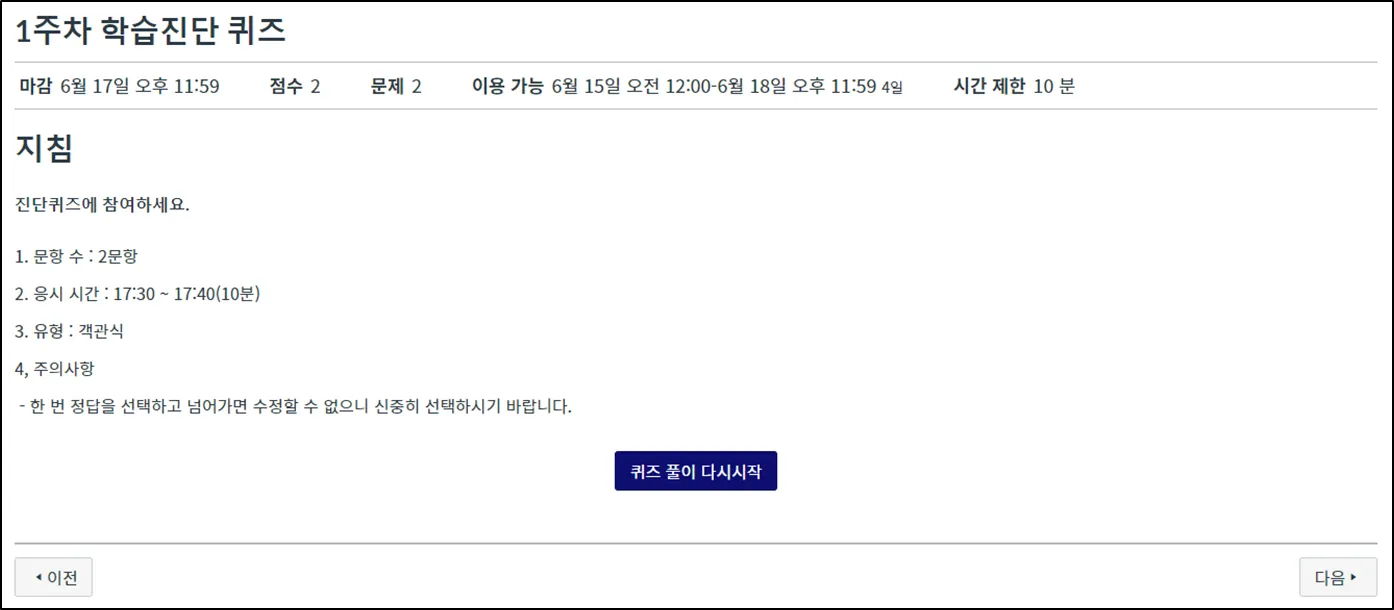 만약 로그아웃 또는 강제종료되어 퀴즈를 재개하려면 [퀴즈 풀이 다시시작] 버튼을 누르십시오.