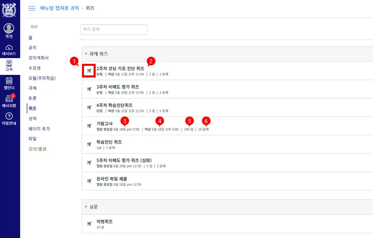 모든 퀴즈에 마감일이 포함되는 것은 아니므로, 마감일이 표시되지 않은 퀴즈는 과목 운영 기간 동안 상시 제출할 수 있습니다.
