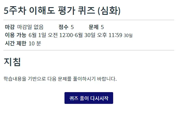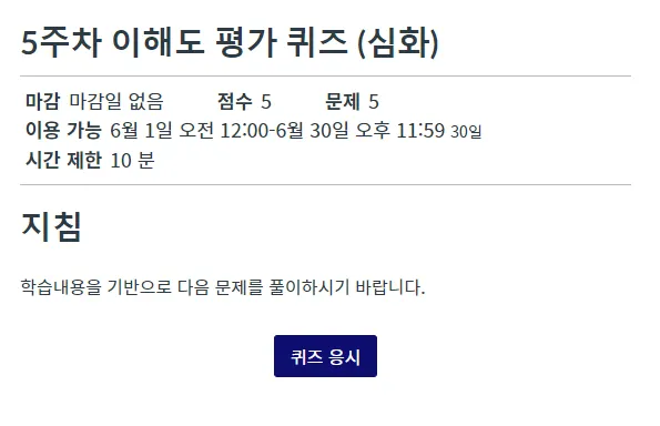 교수자가 작성한 퀴즈의 기본 옵션 및 지침을 확인하고 퀴즈 풀이를 시작하려면 [퀴즈 응시] 버튼을 누르십시오.